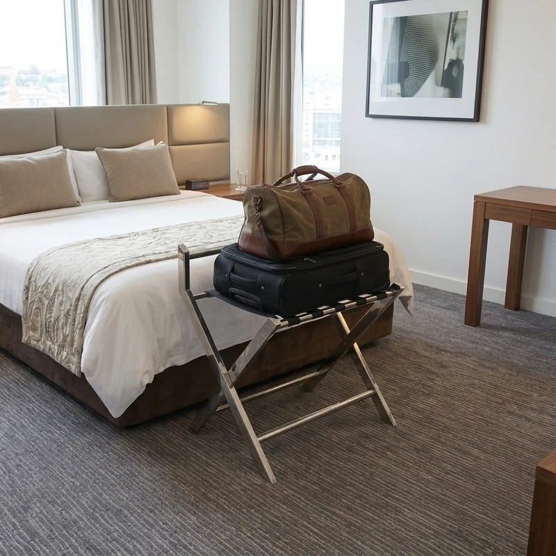 Ez a prémium króm bőröndtartó (FH1705S) a modern elegancia és a kimagasló teherbírás tökéletes ötvözete, amely minden stílusos szállodai szoba alapfelszerelése. A rozsdamentes acélból készült, ezüstszínű váz nemcsak esztétikus, hanem rendkívül tartós és korrózióálló is, így hosszú távú megoldást nyújt. A beépített háttámla megakadályozza a csomagok lecsúszását, egyúttal védi a szálláshely falait a mechanikai sérülésektől.
