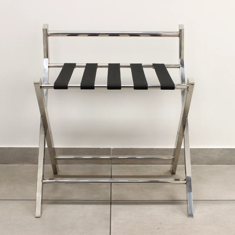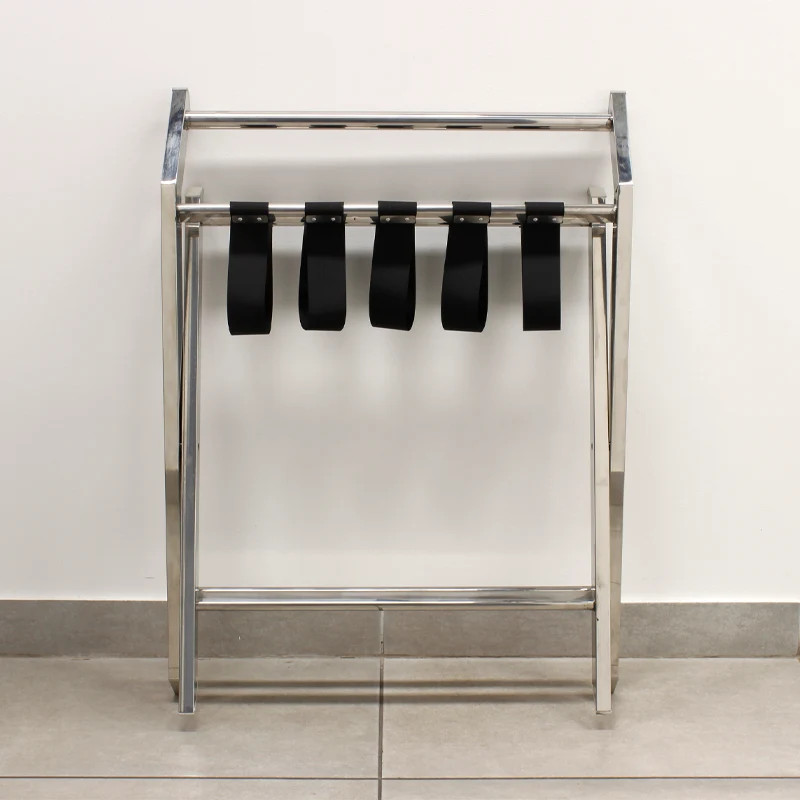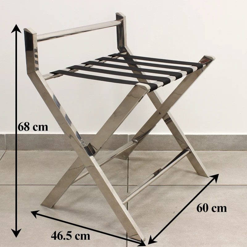 A négy erős szalagból álló tartófelület stabilan megtartja a nagyobb bőröndöket is, miközben 72 cm-es magassága ergonomikus használatot biztosít a vendégek számára. Összecsukható kialakításának köszönhetően használaton kívül mindössze 11 cm mély, így a legkisebb helyen is könnyedén tárolható. Tegye professzionálissá vendégei tartózkodását ezzel a nívós, csillogó króm felületű kiegészítővel, amely a minőséget és a praktikumot hirdeti.
