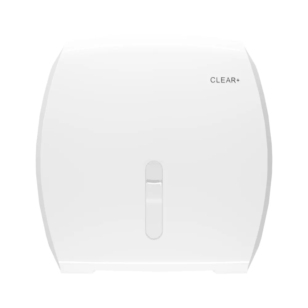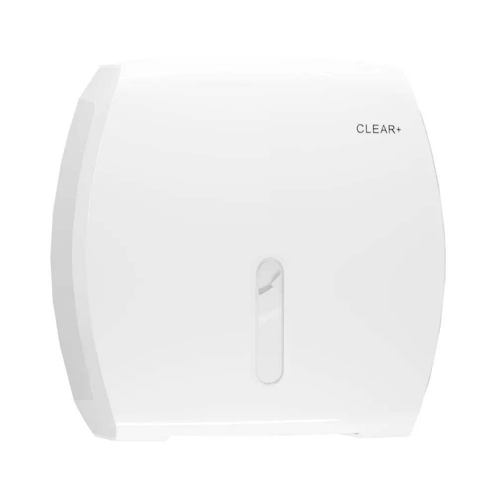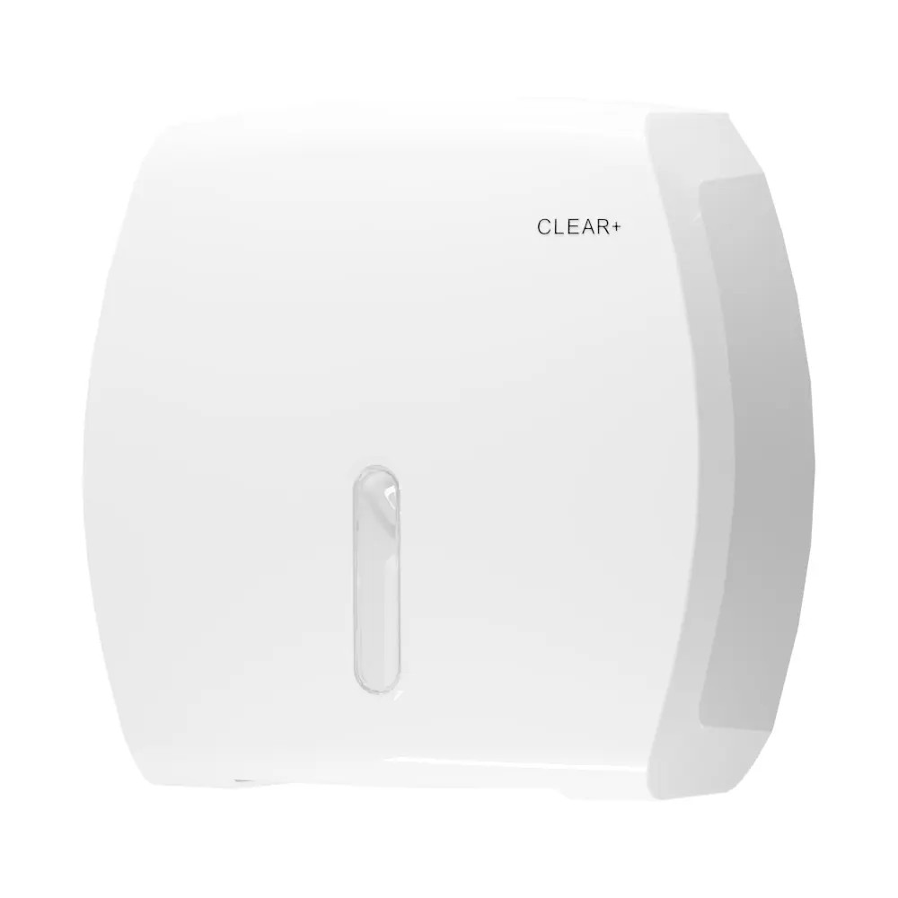 Clear+ Jumbo wc papír adagoló, fehér színű. Könyű vágás a beépített vágóelemnek köszönhetően. Nagy kapacitás a gyakori utántöltés elkerülésének érdekében. Könnyű utántölthetőség, töltésszint ellenőrző ablak. Zárható. 8db/karton.