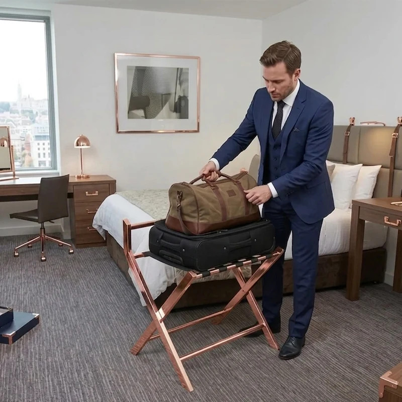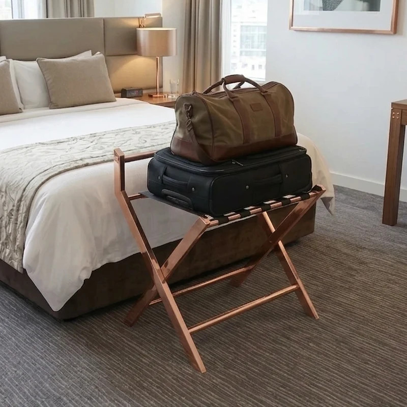 Ez a prémium rose gold bőröndtartó (FH1705RG) a modern elegancia és a kimagasló teherbírás tökéletes ötvözete, amely minden stílusos szállodai szoba alapfelszerelése. A rozsdamentes acélból készült, rose gold váz nemcsak esztétikus, hanem rendkívül tartós és korrózióálló is, így hosszú távú megoldást nyújt. A beépített háttámla megakadályozza a csomagok lecsúszását, egyúttal védi a szálláshely falait a mechanikai sérülésektől.