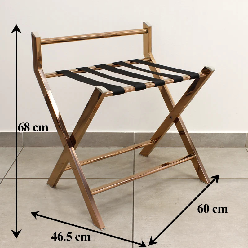 Rose gold színű szállodai bőröndtartó, extra erős, prémium kivitel. 5db fekete erős szalaggal, háttámla hogy a csomagok ne csússzanak le. Rendkívül helytakarékos összecsukott állapotban. Méretek nyitva: 68cm x 60cm x 46,5cm. Méretek csukva: 82.5cm x 60cm x 11cm. Terhelhetőség: 80kg-ig.