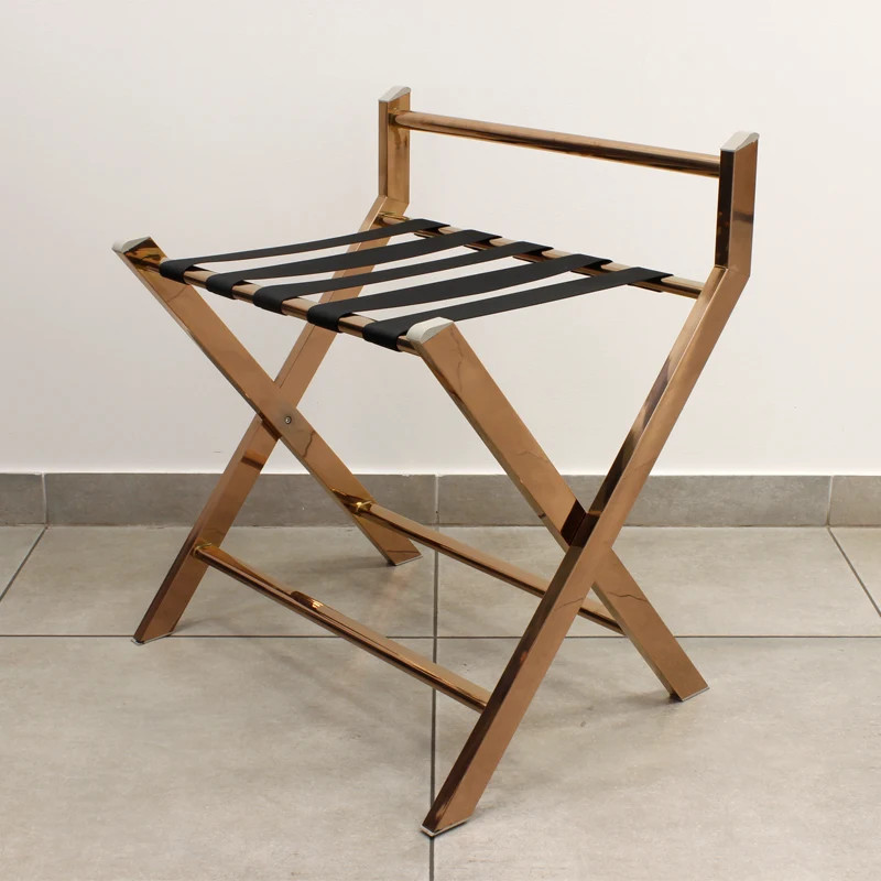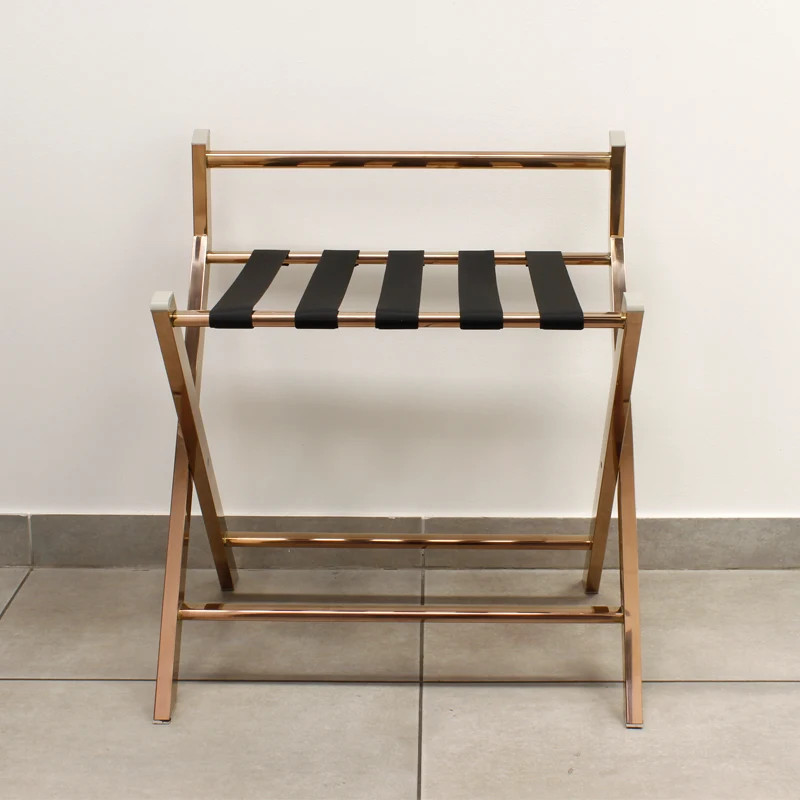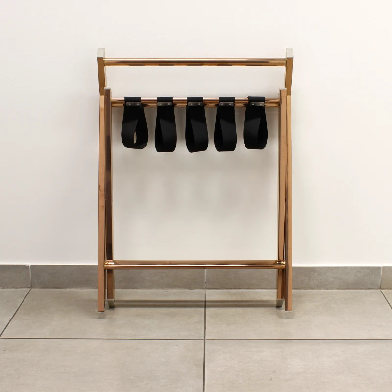 A négy erős szalagból álló tartófelület stabilan megtartja a nagyobb bőröndöket is, miközben 72 cm-es magassága ergonomikus használatot biztosít a vendégek számára. Összecsukható kialakításának köszönhetően használaton kívül mindössze 11 cm mély, így a legkisebb helyen is könnyedén tárolható. Tegye professzionálissá vendégei tartózkodását ezzel a nívós, csillogó rose gold felületű kiegészítővel, amely a minőséget és a praktikumot hirdeti.